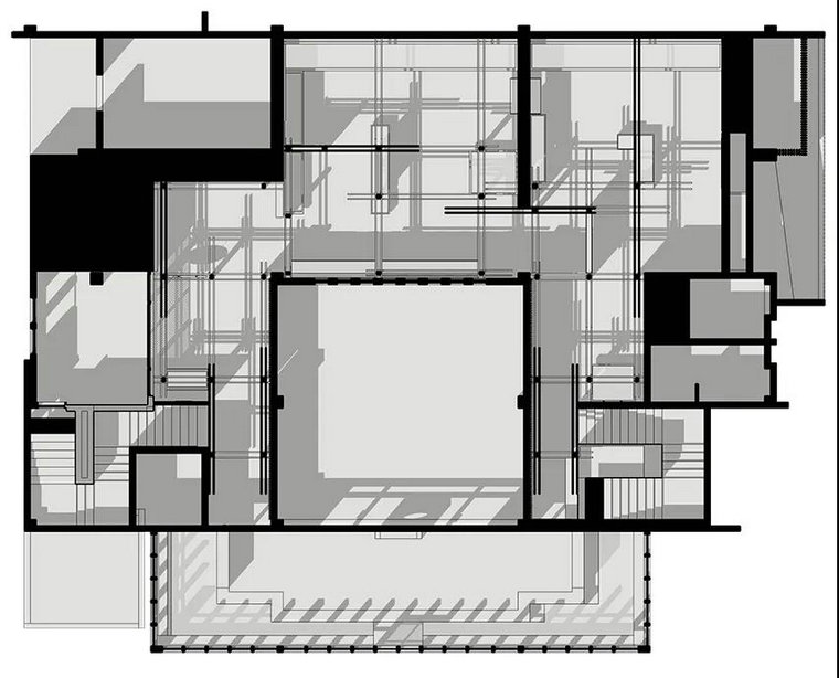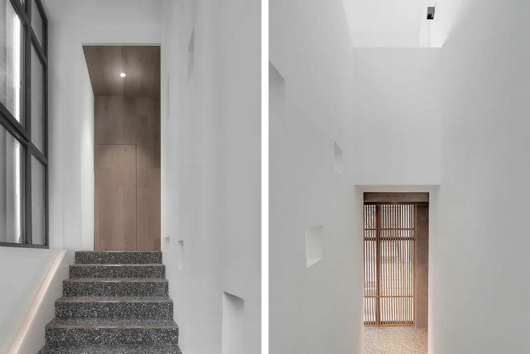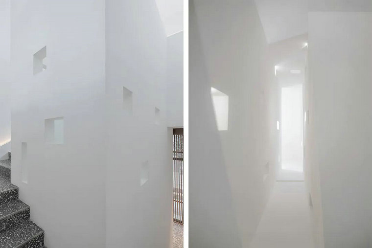 在樓梯間的設計中,設計師通過(guò)反差設計的手法,利用建筑的語(yǔ)言構建一個(gè)純粹明朗的空間,深灰色水磨石瓷磚在其中呈現獨特的意韻。留白墻體的矩形鏤空,將樓梯道的自然光引入到建筑體內,建立了一個(gè)極具儀式感和信仰感的連接空間。