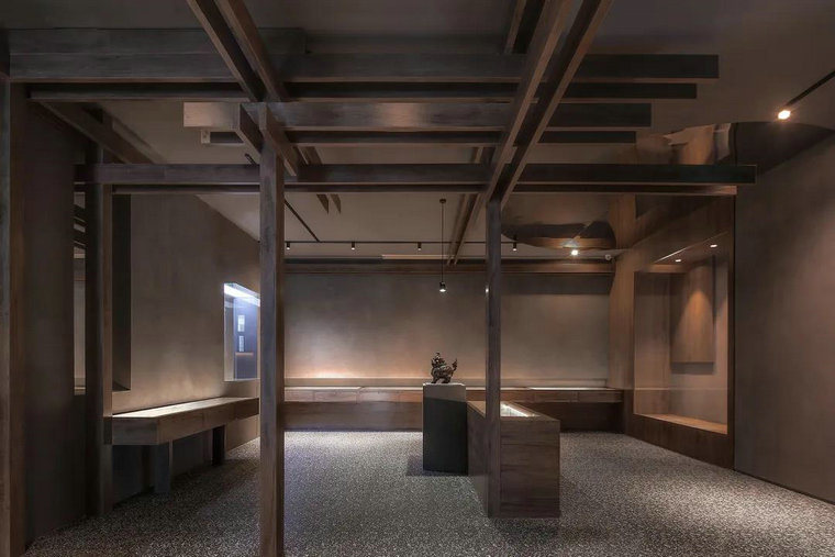 說(shuō)到博物館大部分人會(huì )想到明亮的環(huán)境,豐富的造景,精致的展品,和繁雜的分區等等,而本案這個(gè)律師博物館十分特別,是南京歷史上第一所律師博物館。與其說(shuō)這是博物館,其實(shí)更像一個(gè)“書(shū)架”,將南京法律和律師的歷史細致梳理。每一個(gè)年代下具有代表性的行業(yè)人物和事件,像一本本書(shū),在法律框架的系統和時(shí)間軸線(xiàn)上被封存。設計師將傳統與現代的設計技法和元素巧妙融合,選擇深灰色水磨石瓷磚和原木架構的組合,可謂別出心裁。中式柵格與極簡(jiǎn)鏡面的疊搭,碰撞出非凡的視覺(jué)效果,讓觀(guān)者能在古典建筑形態(tài)結構和簡(jiǎn)約的空間布局中感受莊重肅穆的美,最終將哲思落在法律本身。
