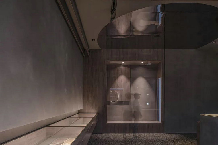 寧靜深邃的氛圍中皎潔的白光,如皓月清暉,遠處影影綽綽的自然光從柵格屏風(fēng)中透入,賦予空間純粹自然的美感。質(zhì)感細膩的深灰色水磨石鋪貼強化了博物館原有的神圣感和莊重感。